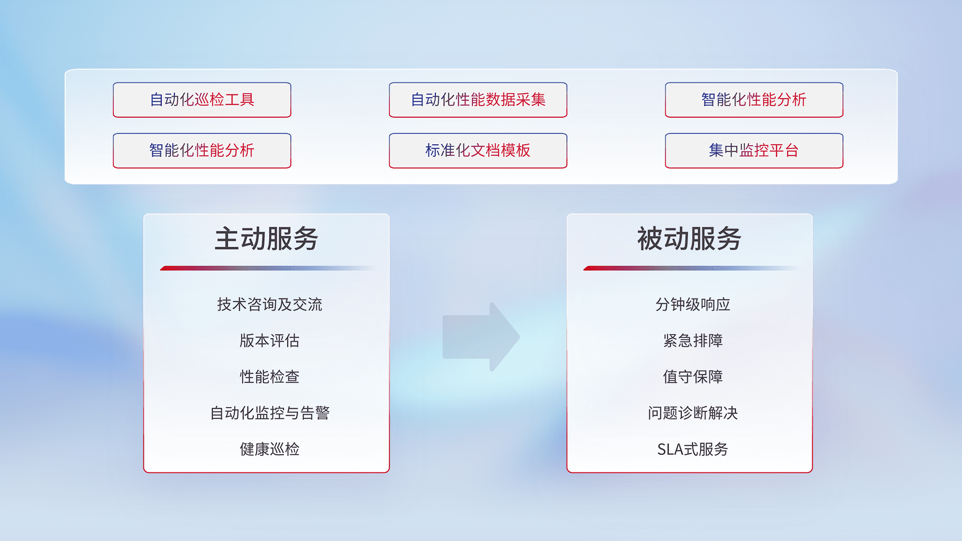 智能化工具和标准化文档,,,,保障服务质量,,提供主动服务(包含技术咨询、、版本评估、、、、性能检查、、自动化监控与告警、、健康巡检)和被动服务包含(分钟级响应、、、紧急排障、、、、值守保障、、、问题诊断解决、、、SLA服务)。。。