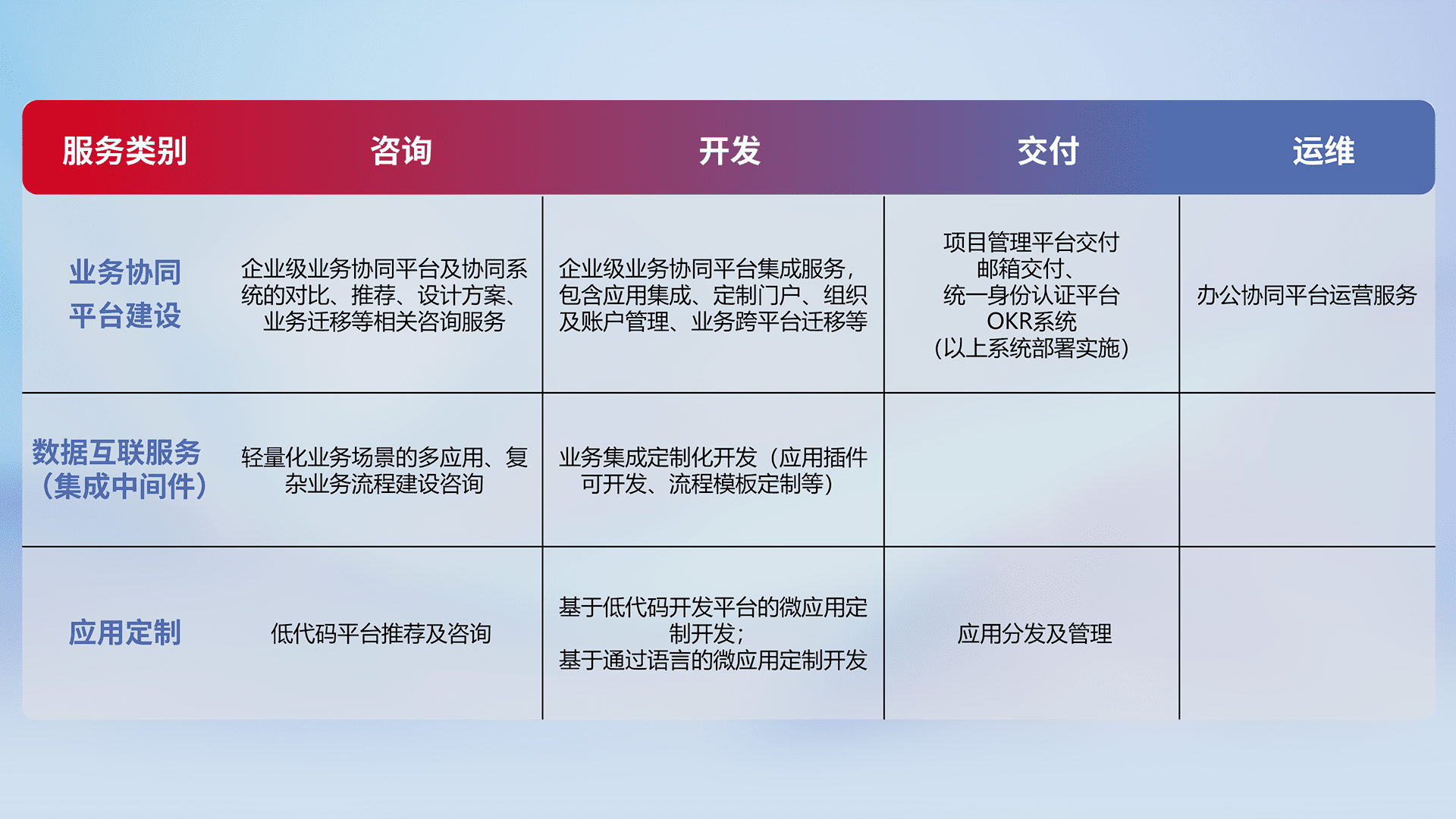 针对钉钉、、、、企微、、、IDaas等平台级产品提供产品的规划、、、方案、、、交付、、、、定制化开发等服务,,,实现如统一协同办公、、智能客户服务、、混合会议管理、、、、智能数据查询、、、、等业务场景,,,实现数字化转型。。